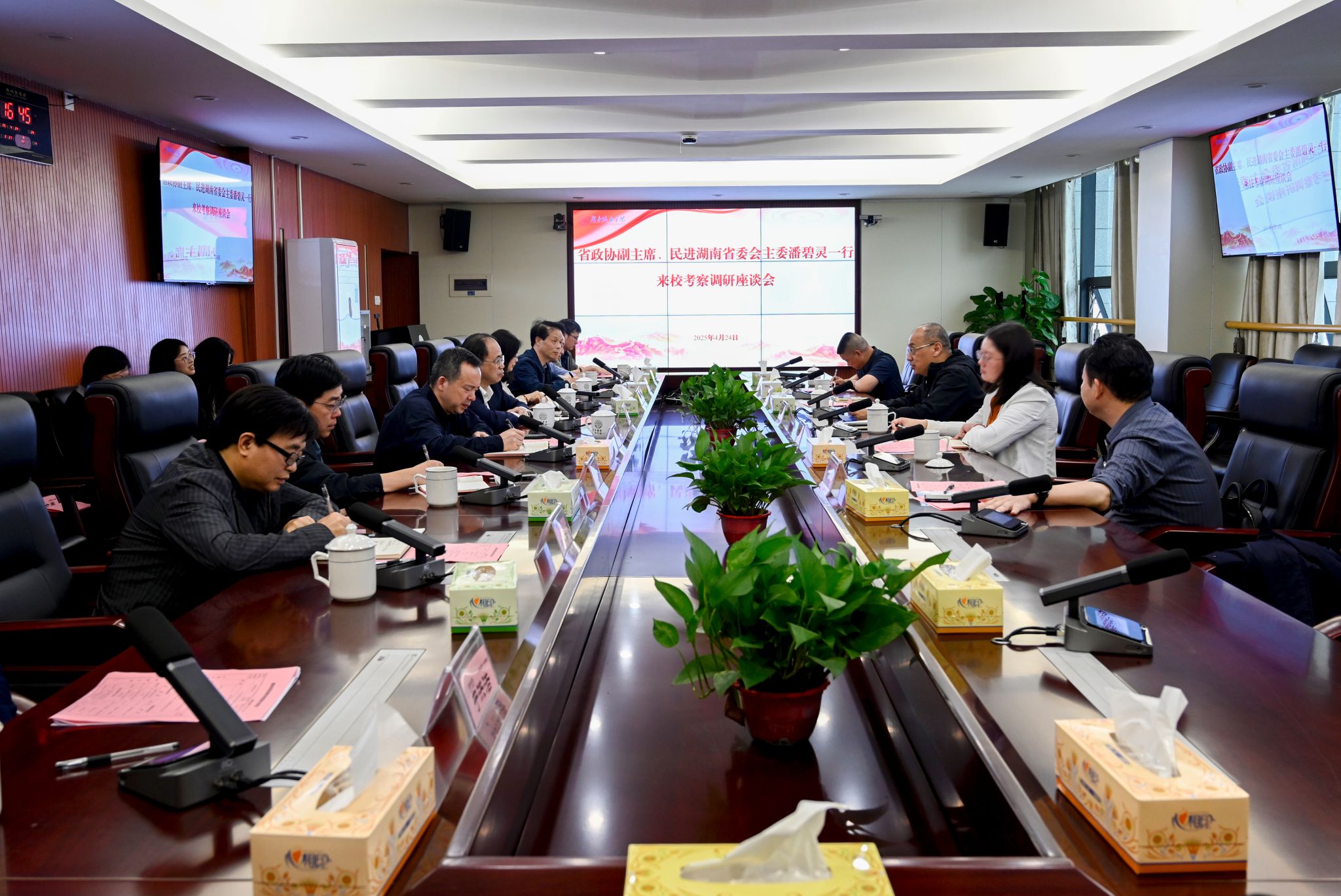 本网讯 4月24日下午,省政协副主席、民进湖南省委会主委潘碧灵一行来校调研,围绕民主党派组织发展建设等问题进行了座谈。校长何振,副校长徐姝,党委委员、组织部部长吕贤军出席会议。