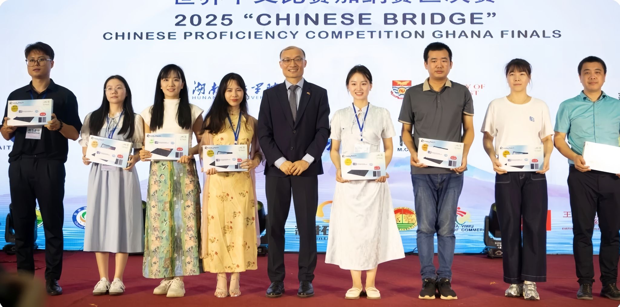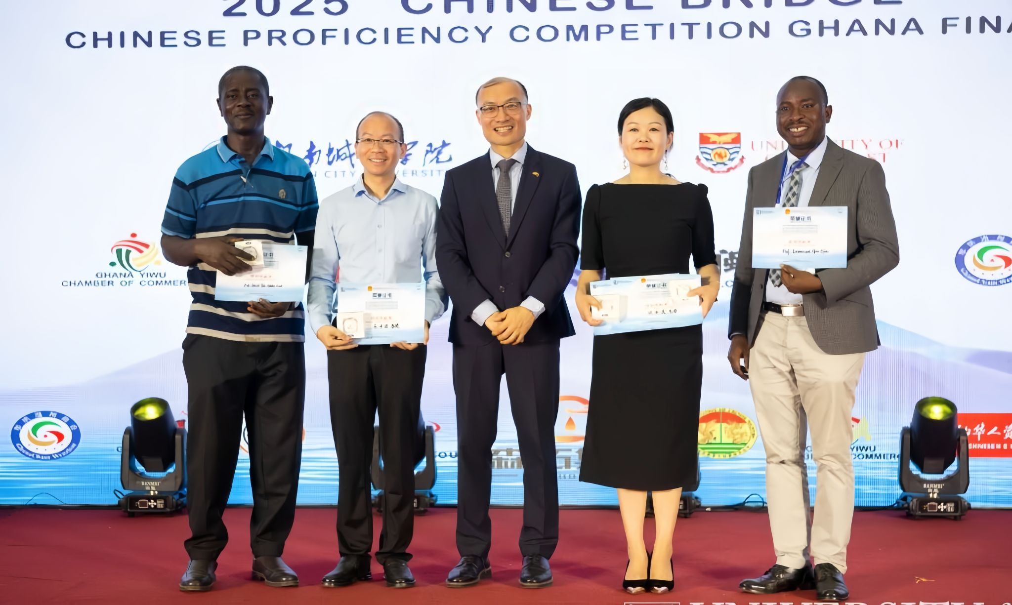 在此次比赛中,孔院学生乔安、明赫、星楚分获小学组冠、亚、季军,张胜获中学组亚军,陈六子、白夕文分获大学组冠、亚军。孔院中方院长欧亚美及刘华波老师分别获得由中国驻加纳大使馆颁发的特殊贡献奖和最佳指导教师奖。这也是该项赛事首次在我校孔院举办,继去年我校孔院包揽加纳赛区中学组和大学组冠军后,今年再次以双冠等优异成绩续写辉煌。