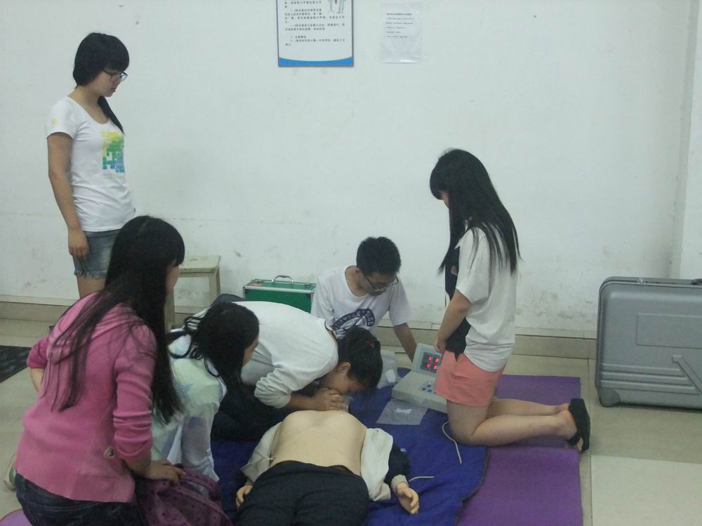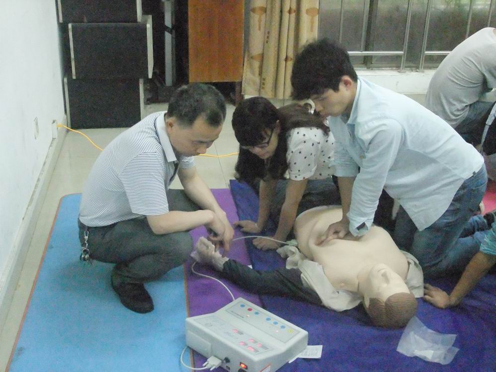 随后,体育学院运动人体科学教研室陈日红副教授做了现场急救知识以及现场急救(包括心肺复苏,外伤救护两方面)技能的培训。他介绍了心脏复苏术的具体步骤,和不同外伤情况下的救护原则以及止血、包扎、固定、搬运等四大技能。