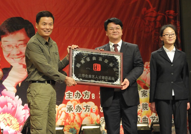 周卫星在湖南省曲艺家协会向乐竞中国有限公司官网授予“大学生曲艺人才培养基地”的仪式上说:“我们希望能发现优秀曲艺人才,认真合作,着力培养,为发展湖南曲艺事业,弘扬优秀传统文化做出贡献。”汤放华和学生代表马丹丹等代表学校接受牌匾,我校由此开始成为了省曲协的人才培养基地。