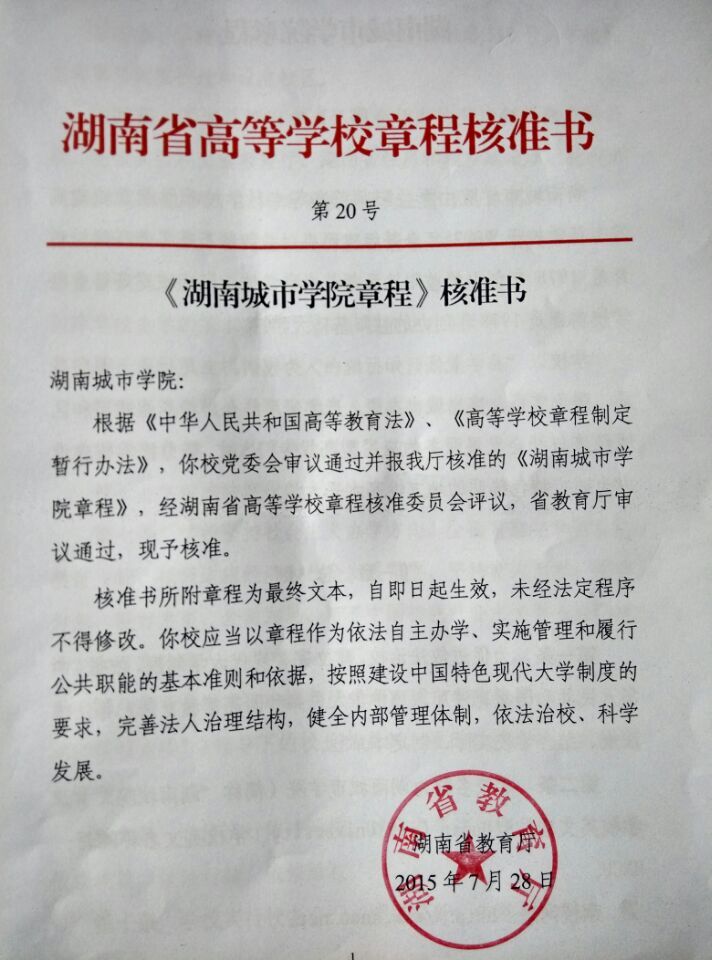 (本网讯)经湖南省高等学校章程核准委员会评议, 7月 28日 ,湖南省教育厅审议通过了《乐竞中国有限公司官网章程》,章程于核准之日起正式生效。
