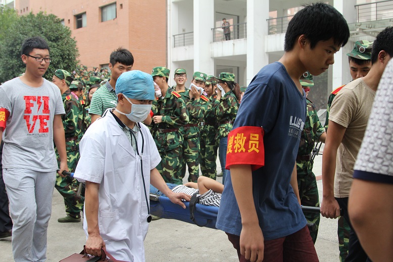 中午1250随着模拟烟雾弹在二教学楼升起,疏散演练正式开始。4000名新生在教官的带领下,弯着腰、猫着步,用湿毛巾捂住口鼻,沿着安全疏散标志快速前进,有序撤离到安全地带。