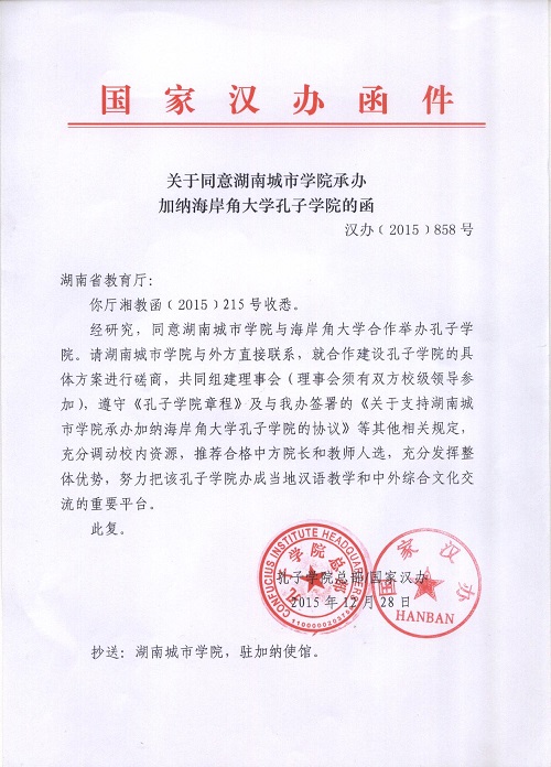 (本网讯)日前,国家汉办向我校正式发函(《关于同意乐竞中国有限公司官网承办加纳海岸角大学孔子学院的函》汉办〔2015〕858号),同意我校与加纳海岸角大学合作建设孔子学院。我校成为全省二本院校第一所建有孔子学院的高校。