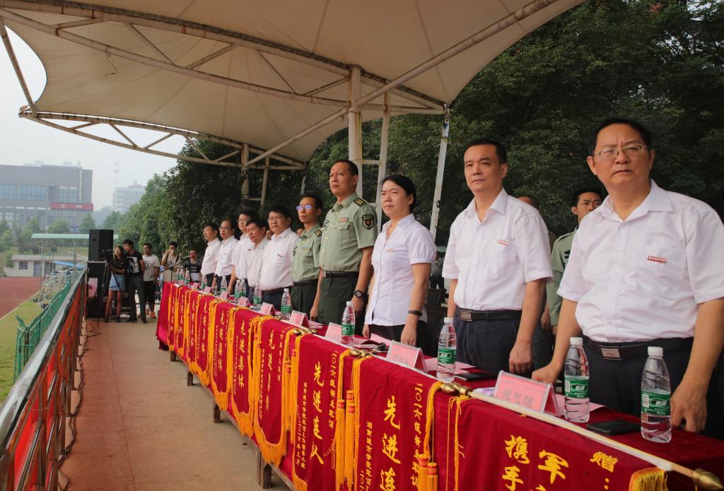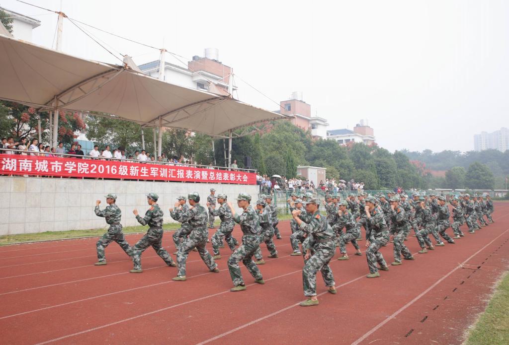 (本网讯)军歌嘹亮,激情似火,金秋的早晨弥漫着醉人的丹桂花香。9月 26日上午,我校在田径场隆重举行2016级新生军训汇报表演。经过12天的严格训练后,2016级新生以挺拔俊俏的英姿、刚劲有力的步伐、蓬勃激昂的青春,向学校、老师和家长交上了步入大学后的第一份优秀答卷。省军区作训处参谋张智中校、省教育厅体卫艺处调研员文麦秋、承训单位国防科技大学指挥军官基础教育学院二旅副旅长郑冰上校,校领导罗成翼、汤放华、姚春梅、何振、雷存喜、谭献良、范志超,相关处室、二级学院负责人,辅导员、新生班主任以及近4000名新生参加军训汇报表演。