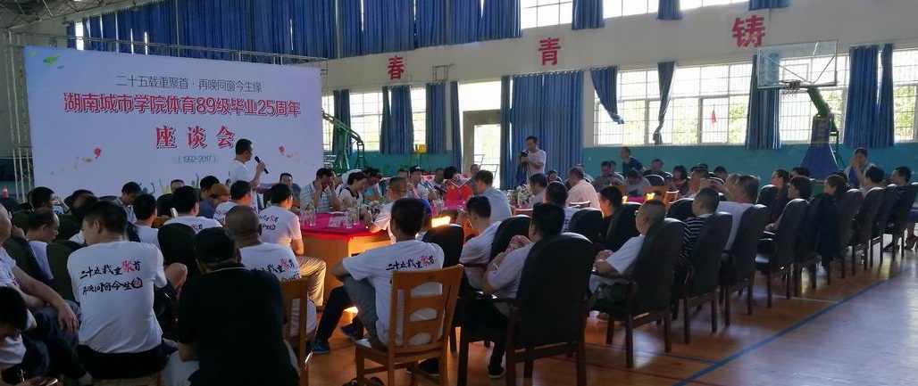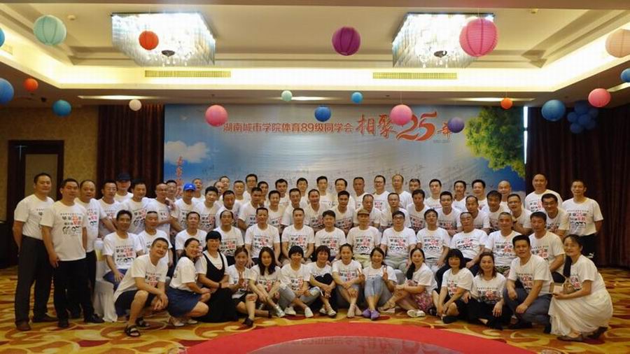 (本网讯)2017年7月21至23日,我校体育学院89级70余名校友齐聚母校举行毕业25周聚会。校长李建奇、党委副书记汤放华、副校长夏宏宇、原学校纪委书记杨斌,校友办负责人、体育学院班子成员、89级任课老师以及全体校友们参加了聚会。