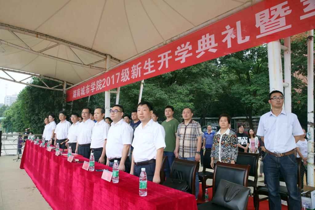 伴随着庄严的国歌和校歌,五星红旗、校旗徐徐升起,开学典礼正式开始。校长李建奇发表了热情洋溢的讲话。他代表学校党委、行政和全校一万八千余名师生员工,向各位新同学表示热烈的欢迎和诚挚的祝贺,向辛勤培育新生成才的各位家长致以崇高的敬意和衷心的感谢。他说,从今天开始,你们就正式成为一名“城院人”了,将学习和践行“品学兼修、知行统一”的校训精神,聆听1200余名老师的谆谆教诲,感受湖湘文化的独特魅力。他勉励大家要修身养德,做高尚道德的践行者;要勤学好思,做优良学风的示范者;要勇于创新,做引领时代的先行者;要仰望星空,做幸福人生的追梦者。