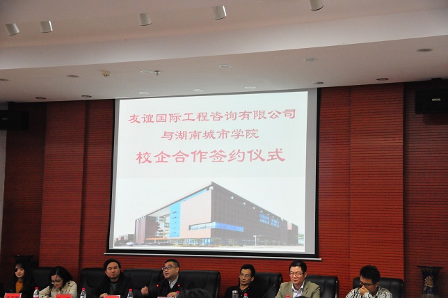 (本网讯)10月19日下午,我校与友谊国际工程咨询有限公司校企合作签字仪式在土木楼报告厅举行。双方正式签署校企合作协议,将在专业建设、人才培养、平台建设等方面开展校企合作。副校长郑卫民、土木工程学院相关负责人,友谊投资咨询集团人力资源总监黄明德、研究院副院长熊浩以及相关部门负责人出席签字仪式。