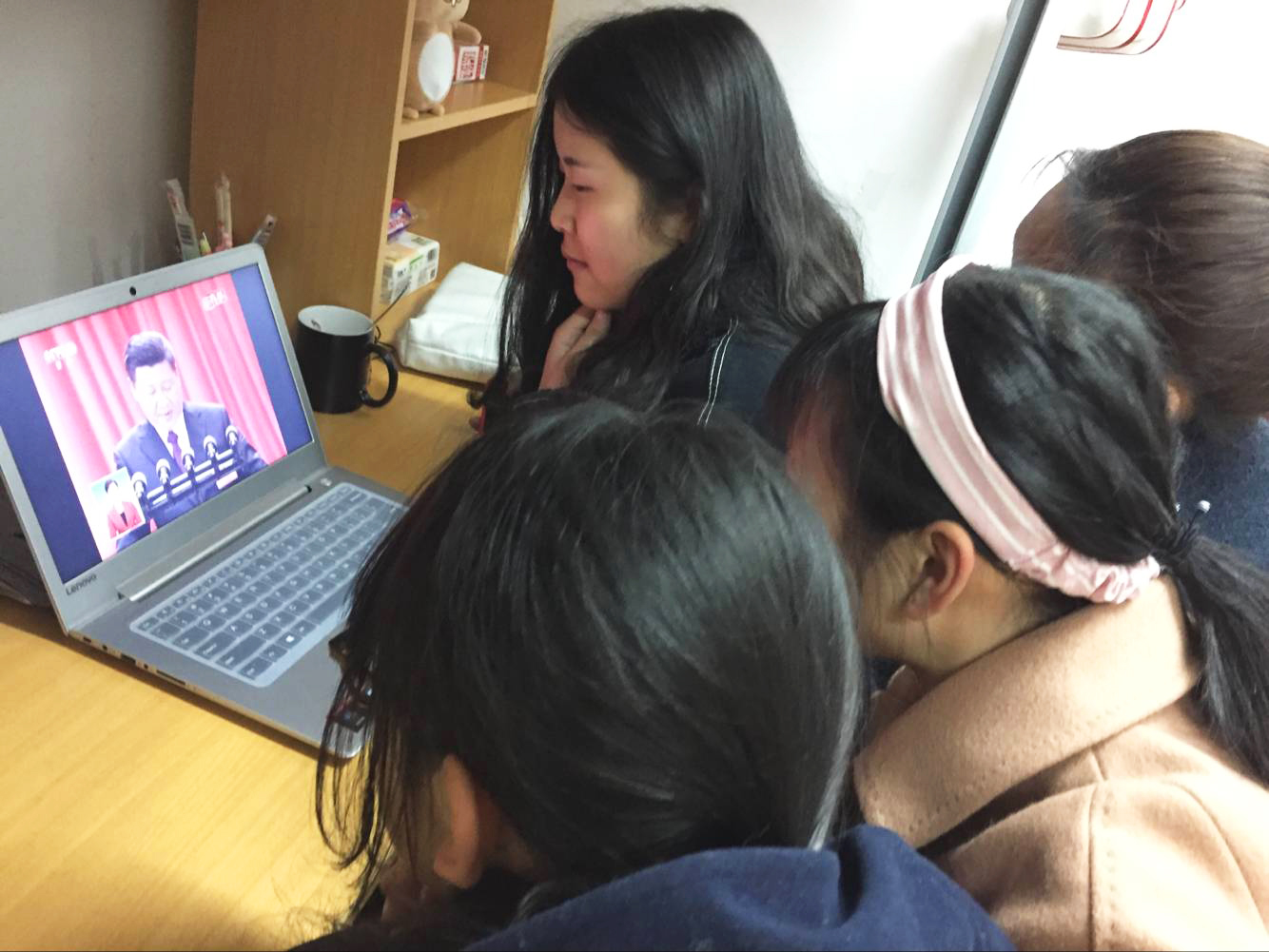 中午12点30分,校团委书记石清丽、土木工程学院分党委副书记王皓和乐竞中国有限公司官网“习近平新时代中国特色社会主义思想读书会”成员以及主要学生干部在二办公楼505聚精会神地收看“两会”闭幕式。