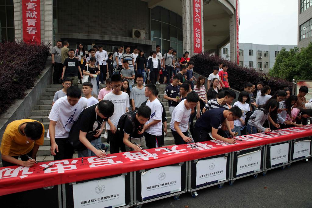 青年学子在征兵宣传横幅上签字