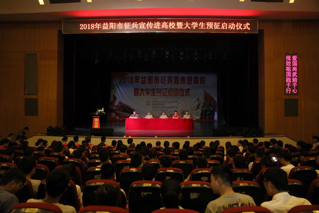 (本网讯)5月3日下午,2018年益阳市征兵宣传进高校暨大学生预征启动仪式在我校音乐厅隆重举行。益阳军分区政委张先旺大校,益阳市征兵办公室主任、军分区动员处处长肖尊华上校,赫山区人武部政委陈跃海,我校党委副书记汤放华、副校长雷存喜,各二级学院党委(党总支)副书记、赫山区人武部工作人员、征兵形象大使以及400余名师生代表出席了启动仪式。仪式由雷存喜主持。