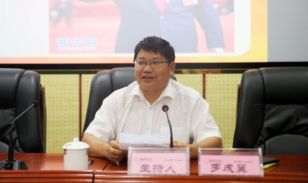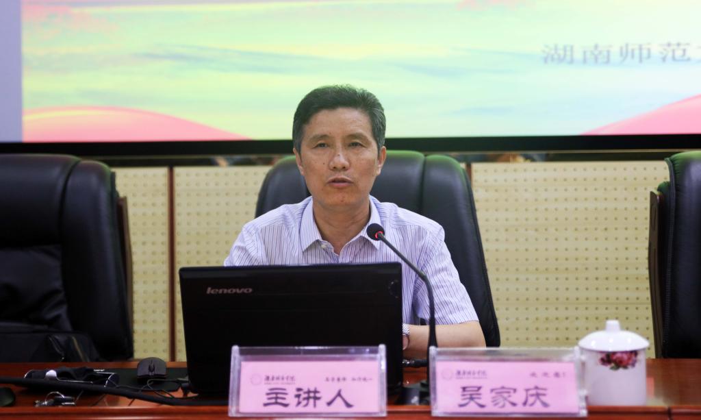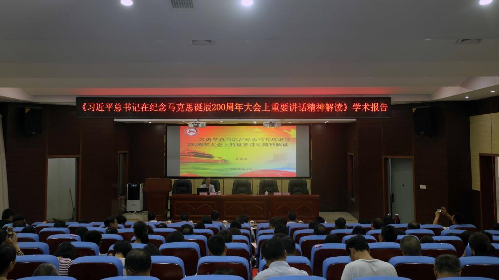 (本网讯)7月5日下午,我校党委中心组(扩大)2018年第四次集中学习在建筑规划楼学术报告厅举行,特邀中央马克思主义理论研究和建设工程首席专家、湖南师范大学马克思主义学院院长吴家庆教授来校,作了一堂题为《习近平总书记在纪念马克思诞辰200周年大会的重要讲话精神解读》的学术报告。报告会由学校党委书记罗成翼主持。相关校领导,党务部门全体人员,各二级学院党委(党总支)书记、副书记、全体辅导员以及马克思主义学院全体教师参加了讲座。