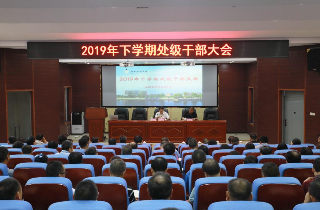 (本网讯)2019年8月27日,我校在建筑规划楼121报告厅召开了2019年下学期处级干部大会。全体校领导和副处级以上干部参加了会议。会议由党委书记罗成翼主持。
