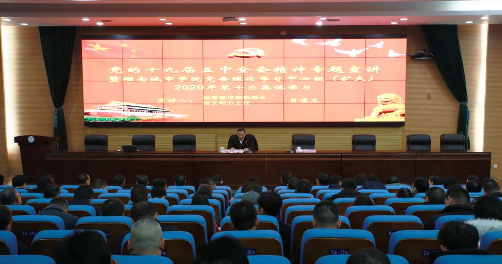 本网讯  2020年12月7日,学校在图书馆报告厅举行党委理论学习中心组(扩大)第十次集体学习,邀请了省委宣传部副部长、省文明办主任肖凌之来校宣讲党的十九届五中全会精神。全体校领导、副处级以上干部、二级党委(总支)中心组成员、党支部书记、学生辅导员300余人参加了会议。会议由党委书记罗成翼主持。