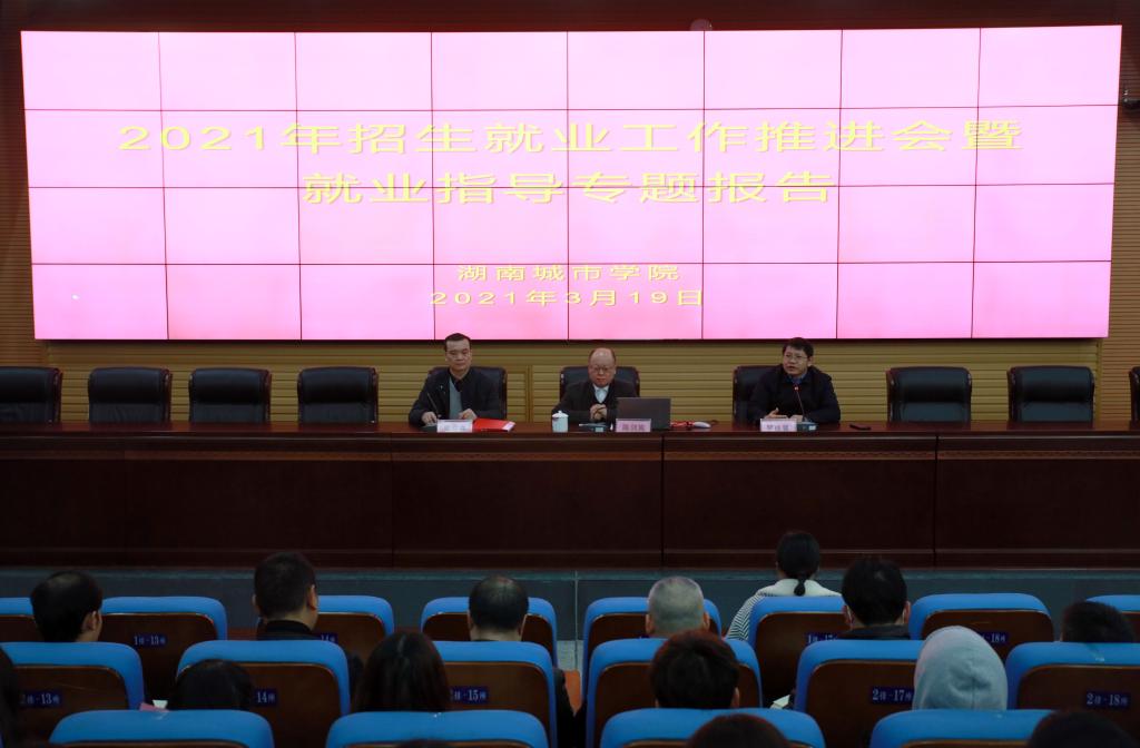 本网讯  2021年3月19日下午,学校在图书馆报告厅召开2021年就业工作推进会,并举办2021年第一期就业指导专题报告会。党委书记罗成翼出席会议并讲话,他要求就业部门和各学院打出就业服务“组合拳”,努力实现毕业生更高质量和更充分就业。湖南信息职业技术学院院长陈剑旄作“结构化面试策略与方法”的就业指导专题报告。