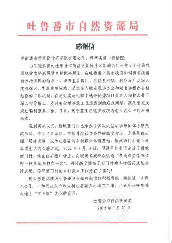 本网讯(记者 文彦波)“衷心感谢你院为吐鲁番乡村振兴做出的积极贡献。期待进一步深化合作……共同见证吐鲁番大地上‘红石榴’之花的盛开。”近日,我校设计研究院有限公司收到吐鲁番市自然资源局的一封感谢信,字里行间表达对我校承担吐鲁番市高昌区新城片区西门村等三个村乡村振兴规划编制工作所产生的积极成效、突出贡献的真挚感谢。7月14日,习近平总书记来到位于吐鲁番市高昌区的新城西门村,高度赞扬了西门村的乡村振兴规划建设成果,称赞西门村的乡村振兴工作走在了前列。