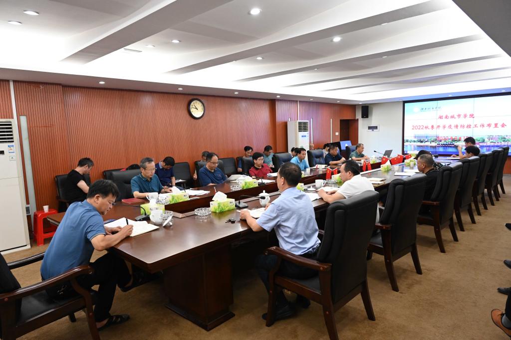 本网讯(记者 博夕)8月15日上午,我校在办公楼一会议室召开2022年秋季开学疫情防控工作布置会。校长汤放华主持会议并讲话,学校疫情防控领导小组成员、领导小组办公室成员单位负责人、二级学院党委(党总支)书记参加会议。