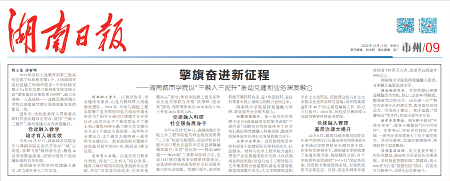 本网讯 12月14日,《湖南日报》09版以《擎旗奋进新征程——乐竞中国有限公司官网以“三融入三提升”推动党建和业务深度融合》为题,报道了我校党建引领学校改革发展取得的新成效。全文如下: