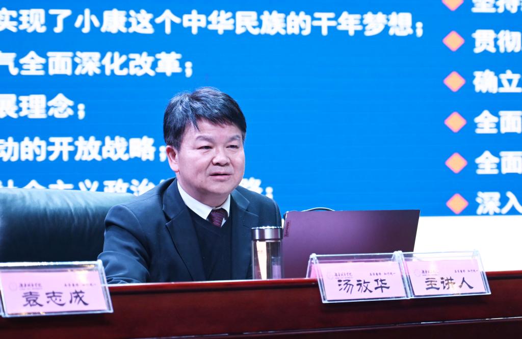 汤放华从经济实力再上台阶、民主政治全面推进、人民生活持续改善、文化自信明显增强、美丽中国步伐坚实等五个方面全面回望了新时代十年中国取得的瞩目成就。他表示,党的二十大擘画了以中国式现代化全面推进中华民族伟大复兴的宏伟蓝图,把宏伟目标变为美好现实,奋进正当其时。要坚持“四个服务”,践行初心使命。要肩负历史责任,争当时代先锋。