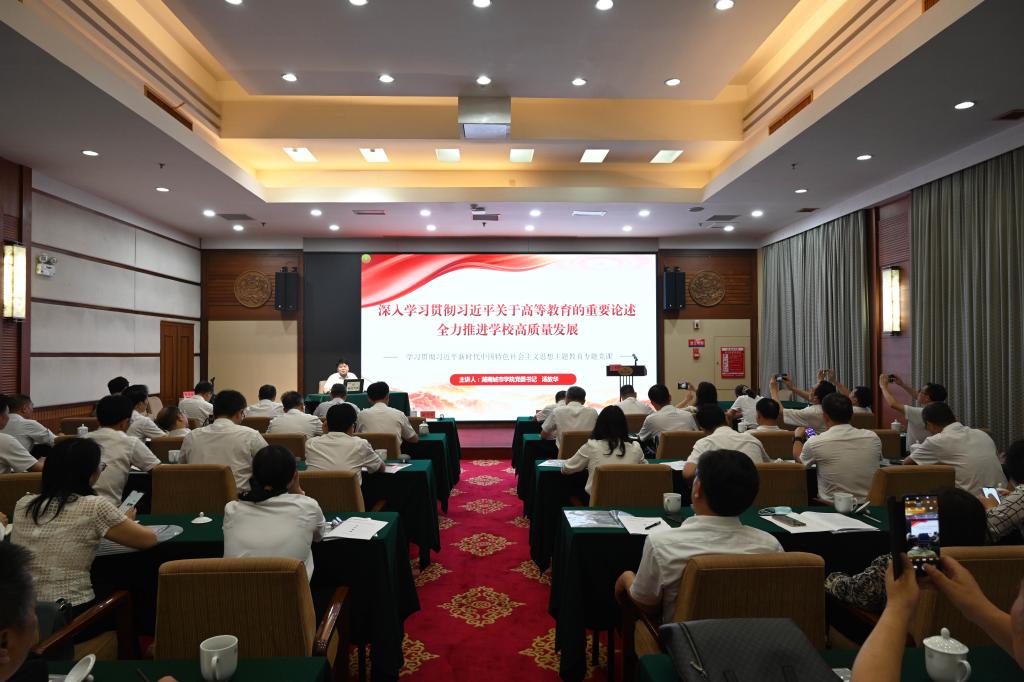 下午,全体成员在韶山宾馆会议室进行了“以学增智”专题学习研讨。汤放华以《深入学习贯彻习近平关于高等教育的重要论述 全力推进学校高质量发展》为题,为大家上了一堂深刻的党课。汤放华紧密结合当前高等教育新形势和学校发展新情况,通过详实的数据对比、丰富的案例讲解,从领会精神、再学习再思考习近平总书记关于教育重要论述,审时度势、切实增强教育强国的责任感使命感和紧迫感,狠抓落实、谱写新时代新征程乐竞中国有限公司官网高质量发展新篇章三个方面,阐述了学习贯彻习近平总书记关于教育的重要论述我们要做什么、怎么做的问题。