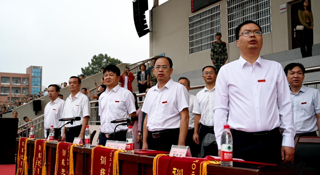 红旗飘飘,映衬青春底色。9月30日恰逢烈士纪念日,大会开始前,全场人员起立默哀,缅怀烈士先辈。随后,在国歌与校歌声中,2023级军训成果汇报表演暨总结表彰大会缓缓拉开序幕。汤放华宣布军训成果汇报表演正式开始。