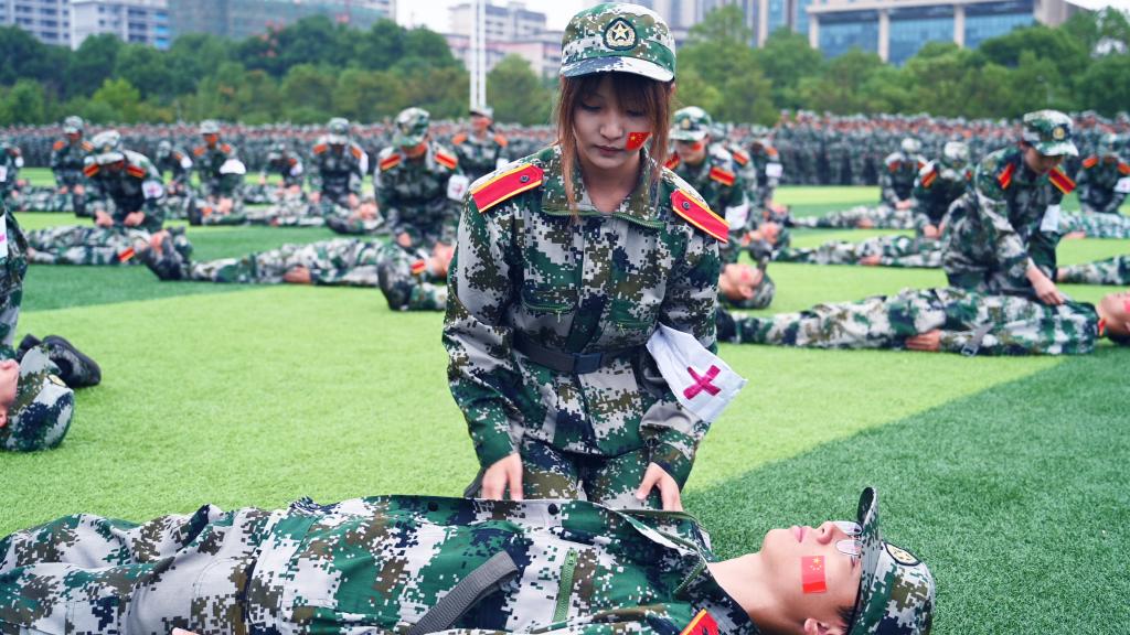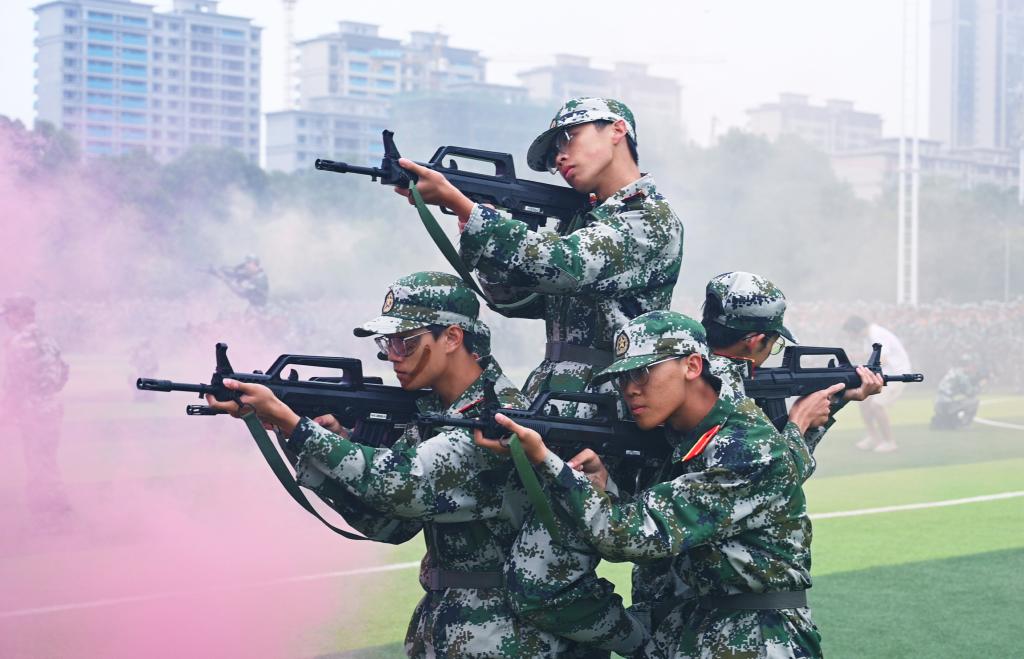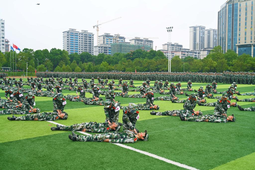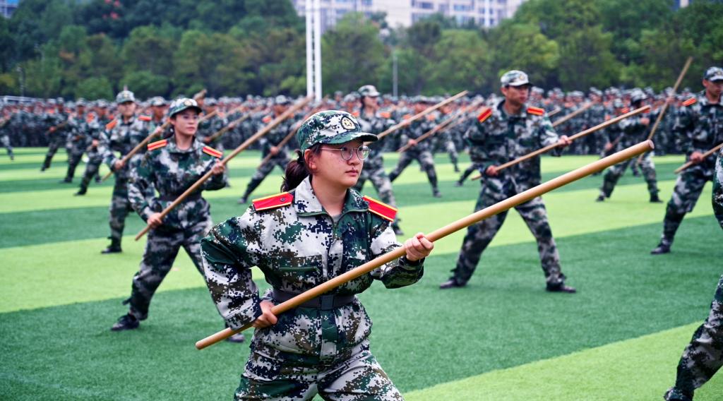 汇报表演中,《应急棍术》《战场医疗救护》《军体拳》等精彩节目轮番上演。由人文学院和理学院带来的旗舞飞扬方阵成为全场亮点。新生们英姿飒爽,步伐矫健,口号嘹亮,他们舞出的旗语操以其整齐划一的动作、虎虎生威的气势、团结协作的精神,熟练地用挥旗动作舞出“无声语言”;“杀!杀!杀!”324名捕俘刀队员动作干净利落、精准有力,个个威猛霸气,一招一式,尽显豪气;“砰!”爆破声后,操场硝烟弥漫,战友们演示“搜索前进”“滚进”“滑跪”等战术基础动作,干净利落,举止果断……现场热情高涨,掌声雷动,欢呼声不断。