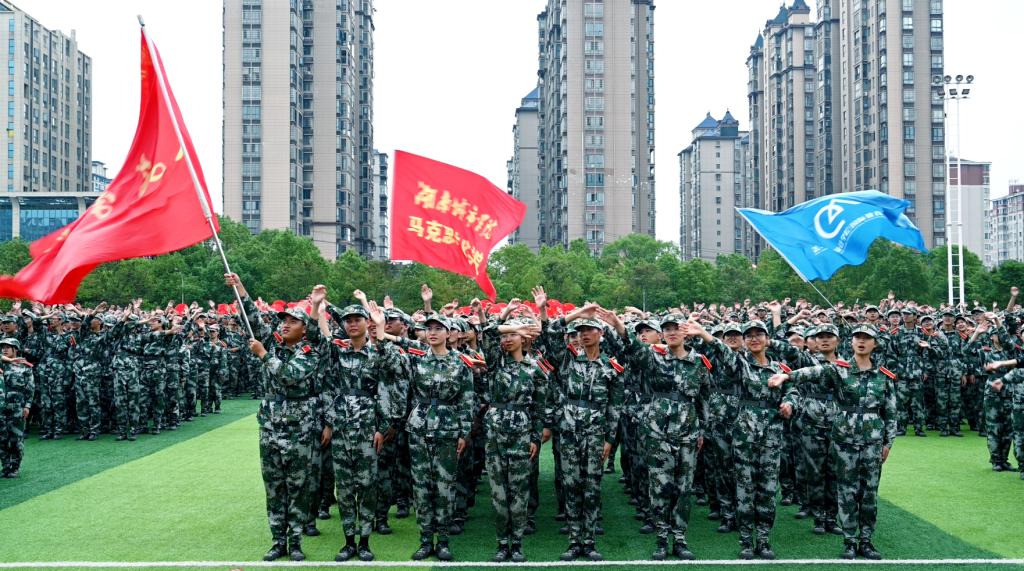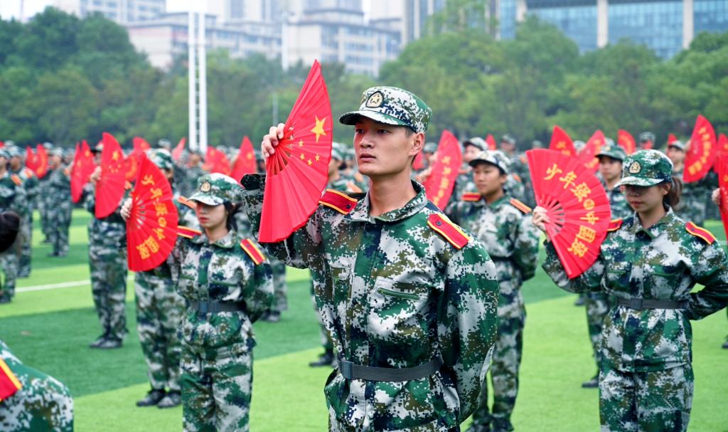 分列式进行曲响彻全场,教官分队持枪入场,眼神坚毅。他们以豪迈的激情斗志、过硬的军事素养向全校师生展现昂扬奋发、勇敢坚毅的精神风貌和青春风采。十三个二级学院方阵紧随其后,身着戎装的新生喊着铿锵有力的口号,迈着整齐矫健的步伐,向全校师生展示军训成果,接受全场的检阅。