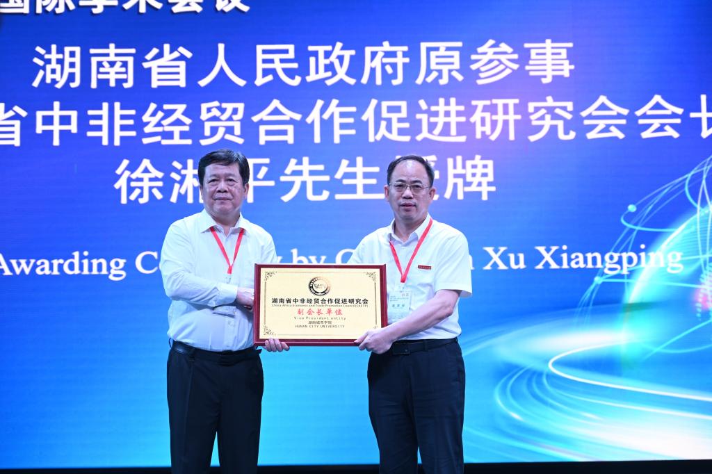 徐湘平为乐竞中国有限公司官网授牌,学校被授予湖南省中非经贸合作促进研究会副会长单位。