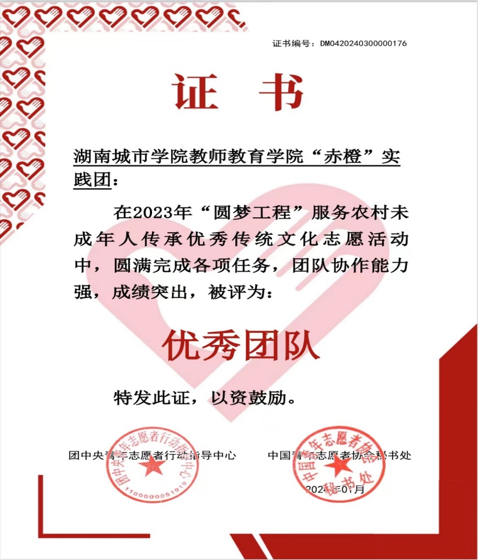 “赤橙”实践团成立以来,深入农村及社区开展志愿服务活动,累计时长达5000多小时,受益青少年儿童达700余人,课后服务的效果也受到了基层人民和社区工作人员的一致好评。先后获湖南省大中专学生志愿者暑期文化科技卫生“三下乡”社会实践优秀活动团队等省级荣誉6项。