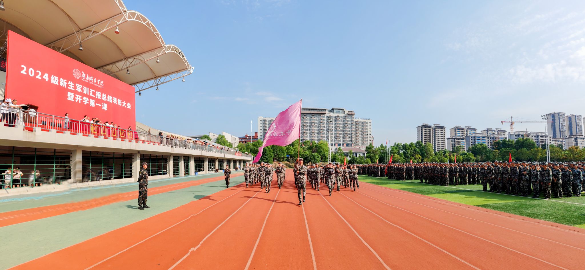 分列式进行曲响彻全场,教官分队持枪入场,眼神坚毅。他们以豪迈的激情斗志、过硬的军事素养向全校师生展现昂扬奋发、勇敢坚毅的精神风貌和青春风采。十四个二级学院方阵紧随其后,身着戎装的新生喊着铿锵有力的口号,迈着整齐矫健的步伐,向全校师生展示军训成果,接受全场的检阅。