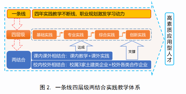 土木工程学院高度重视实践实训教学,将其视为培养学生实践能力和创新精神的重要途径,校企深度合作,突出学生工程实践能力与创新意识的培养,构建了“一条线四层级两结合” 实践教学体系(图2),成果获省级教学成果二等奖。
