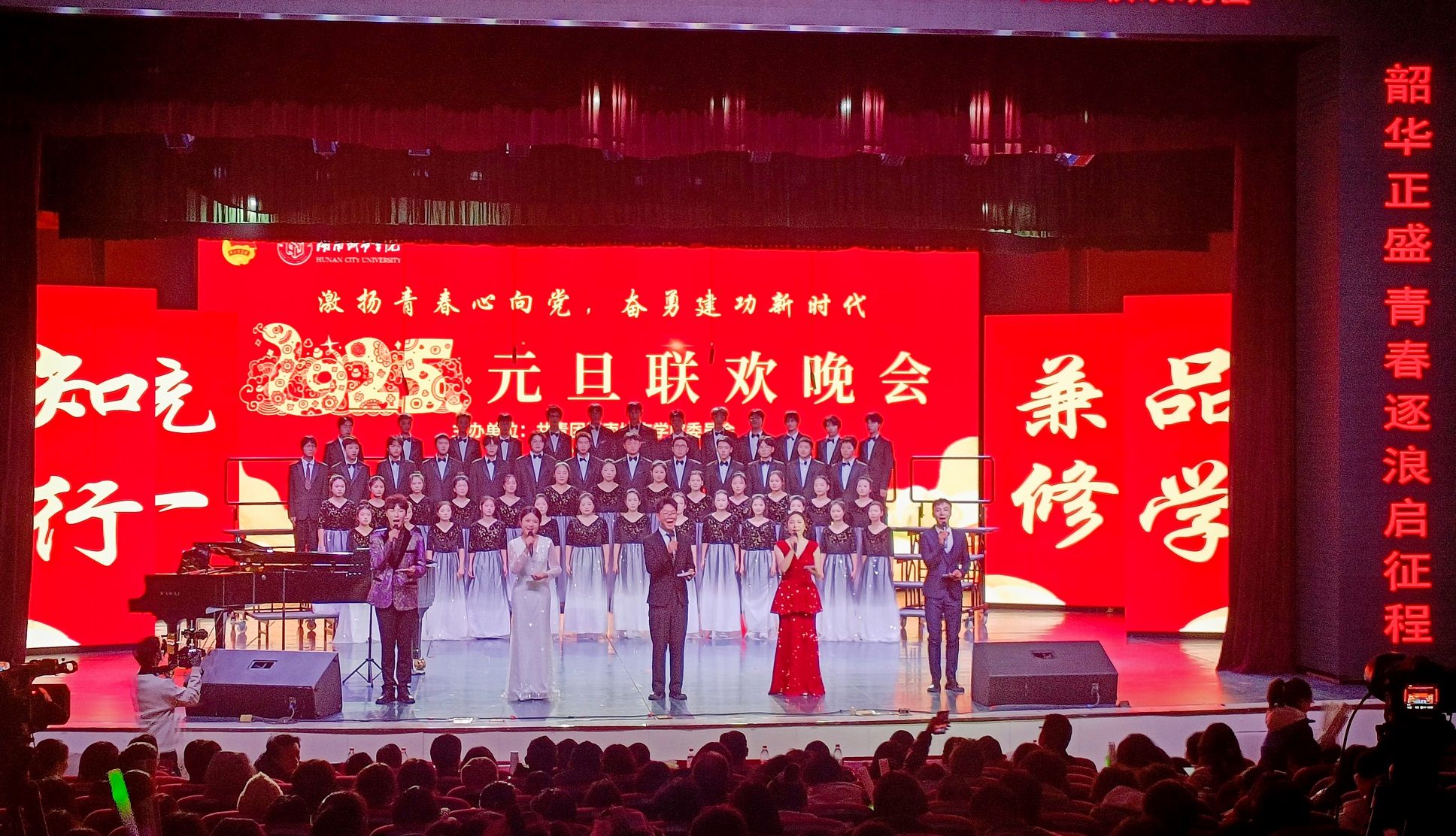 本网讯(通讯员 孔军)祥龙贺岁辞旧去,灵蛇纳祥启新程。12月30日晚,我校在音乐厅举行2025年元旦晚会。全体校领导,各二级学院、部门相关负责人出席观看晚会。在两个多小时的晚会中,线上线下12000余名师生、校友欢聚一堂,共同辞旧迎新。