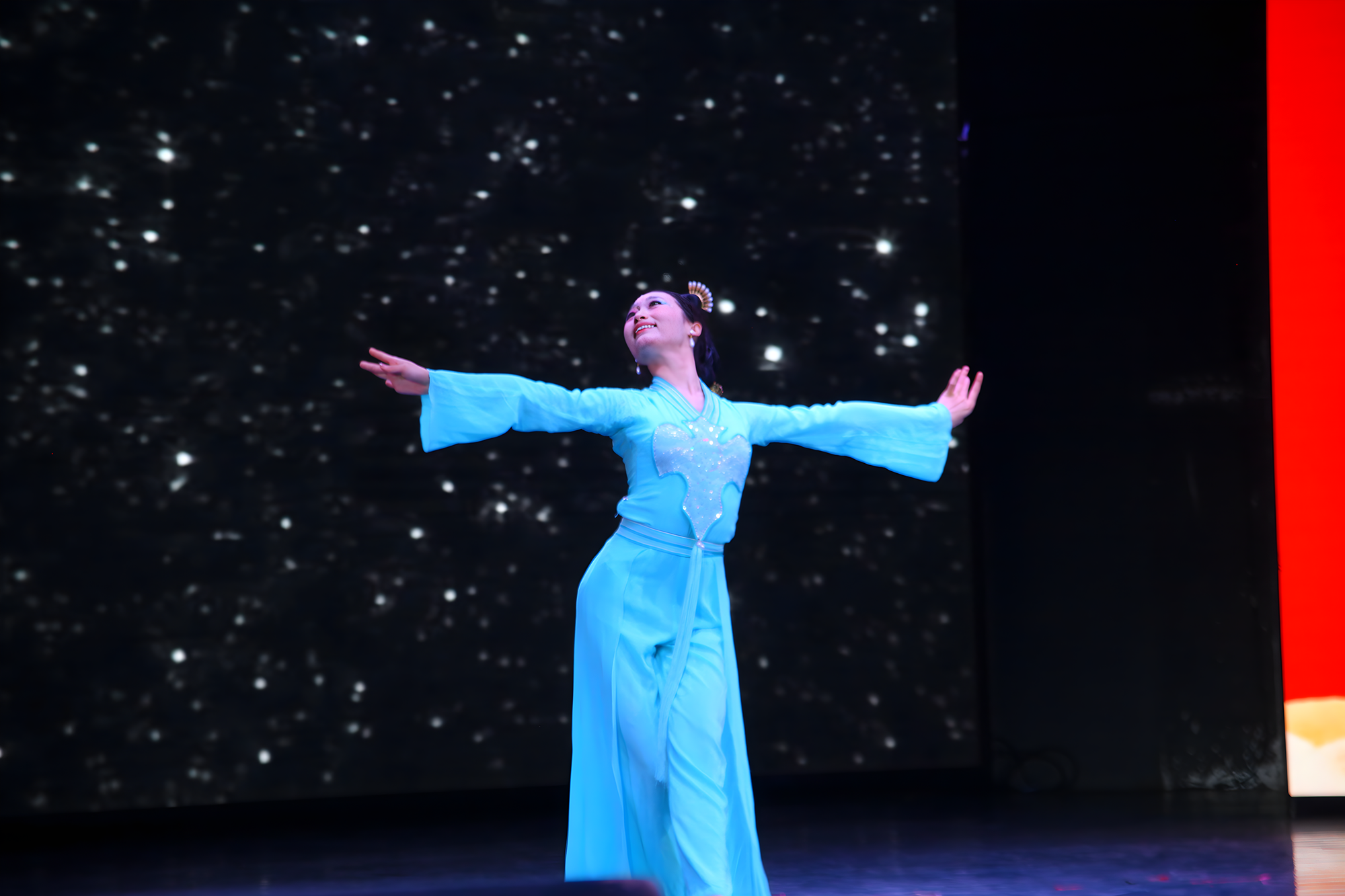 伴随着全场挥舞的校旗,大学生艺术团带来的歌曲《未来我来》展示出城院学子们积极向上的心态、勇于担当的精神、团结合作的力量和青春洋溢的风采;音诗画《山河无恙》,带领现场观众回到那个波澜壮阔的时代,去感受先辈们的热血与激情;在国风舞蹈《采薇》中,舞者们身着飘逸的汉服,在台上舞动,将观众带入了一个诗情画意的世界,穿越古今;朗诵《英雄》抑扬顿挫、跌宕起伏,讲述着无数英雄的故事,真切表达学子们拳拳爱国之心。副校长徐姝携手外籍教师孙娜一同演绎了歌曲《花火》,优美的旋律与动人的唱腔相得益彰,传达了希望与梦想的力量,她们的表演充满了真挚的情感,打动了在场的每一位观众。