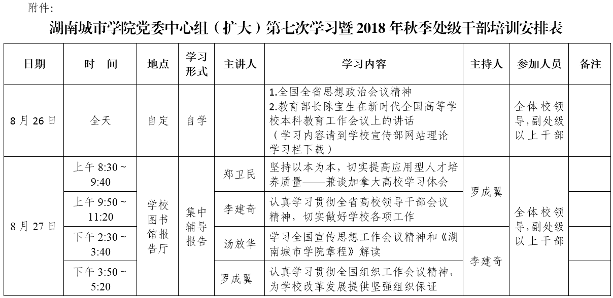 本次学习、培训采取辅导报告、个人自学的方式进行,具体安排见《乐竞中国有限公司官网党委中心组(扩大)第七次学习暨2018年秋季处级干部培训安排表》。