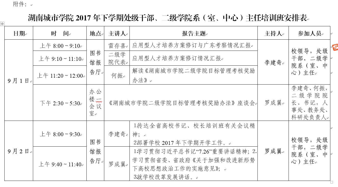 具体培训安排见《乐竞中国有限公司官网2017年下学期处级干部、二级学院系(室、中心)主任培训班安排表》。