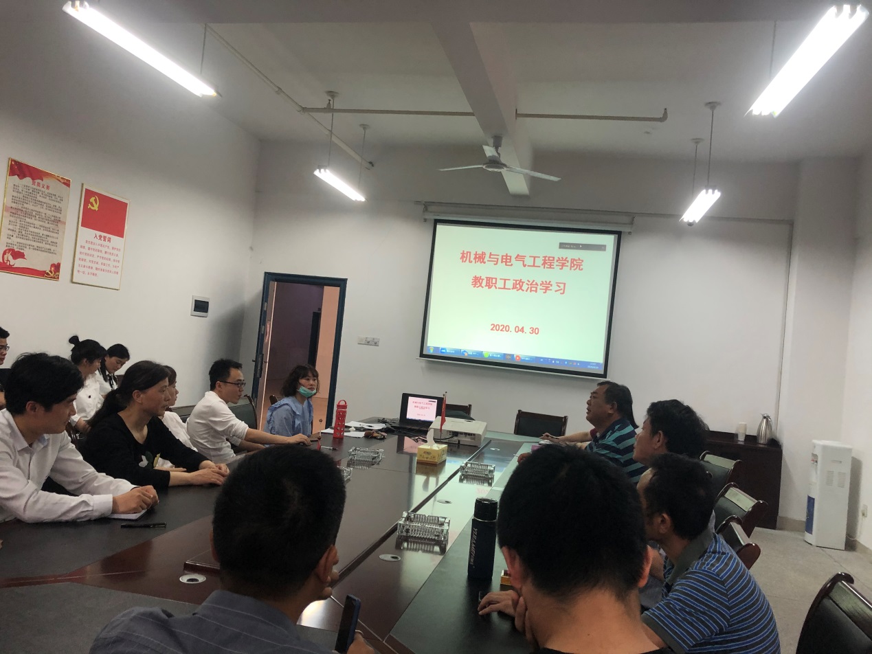 进一步贯彻传达乐竞中国有限公司官网四届五次教职工、工会会员代表大会成果和精神,2020年4月30日下午,机械与电气工程学院在会议室召开了全院教职工政治学习。由于疫情的影响,本次政治学习采取现场学习与线上会议相结合的形式举行,会议由党总支书记徐畅贤主持。