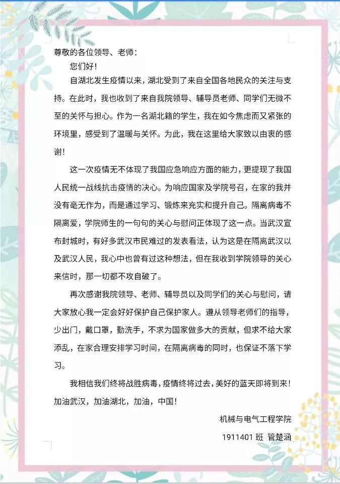 “学院期盼着你们每个人平安归来,待到春暖花开,我们校园再会!”